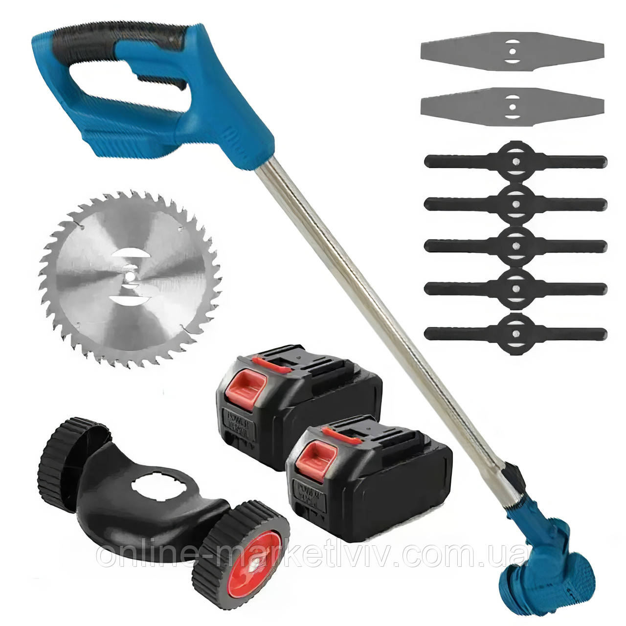 В комплект входят силовое устройство и штанга с редуктором, защищенная чехлом. Используя ремень, оператор держит газонокосилку в руках, направляя режущий элемент на нужный участок.
